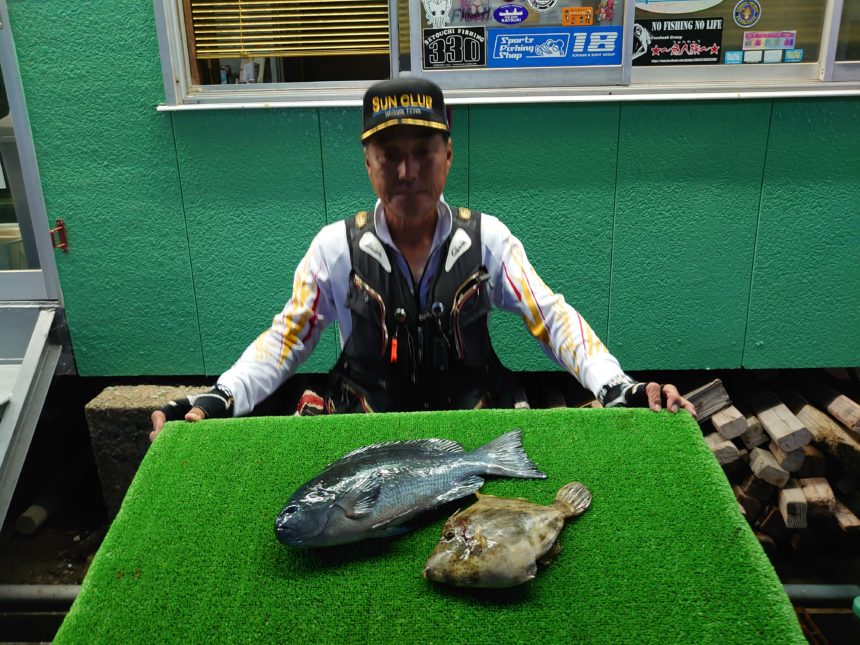 半夜釣りで三浦さんがグレ41cm、カワハギをゲット。