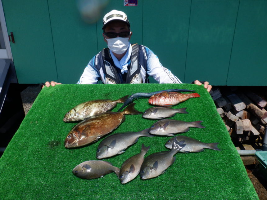 磯釣りで是川さんがグレ、アイゴ、イガミ、ダツをゲット。
