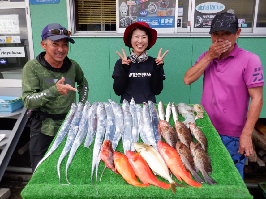 2020.09.11 UP ボート釣り釣果 船外機ボートでチームどしゃ降りさんがタチウオ、アオリイカ、オオモンハタ、アカハタをゲット。 釣行日 2020年09月11日 釣り人 チームどしゃ降り コメント メタルジグ、エギ。