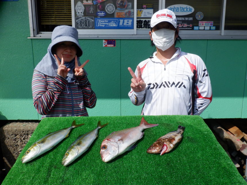船外機ボートで牧森さんがウスバハギ、ツバス、メイチ、マダイをゲット。