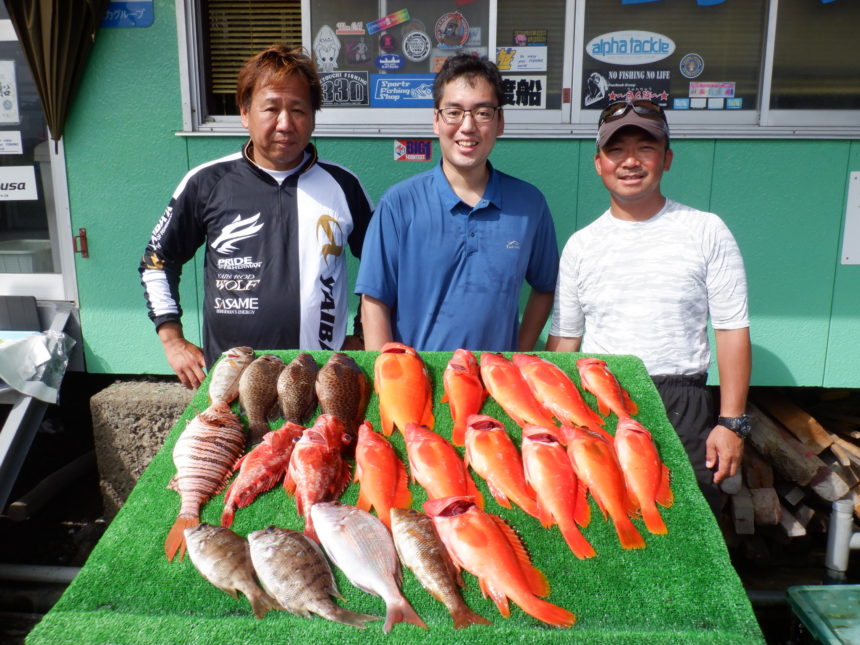 船外機ボートで大島さんがアカハタ、オオモンハタ、カサゴをゲット。