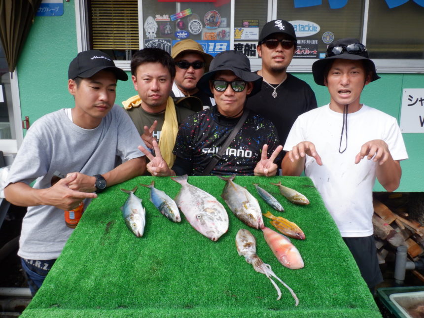 船外機ボートで西村さんがシオ、ウスバ、ツバス、アオリイカをゲット。