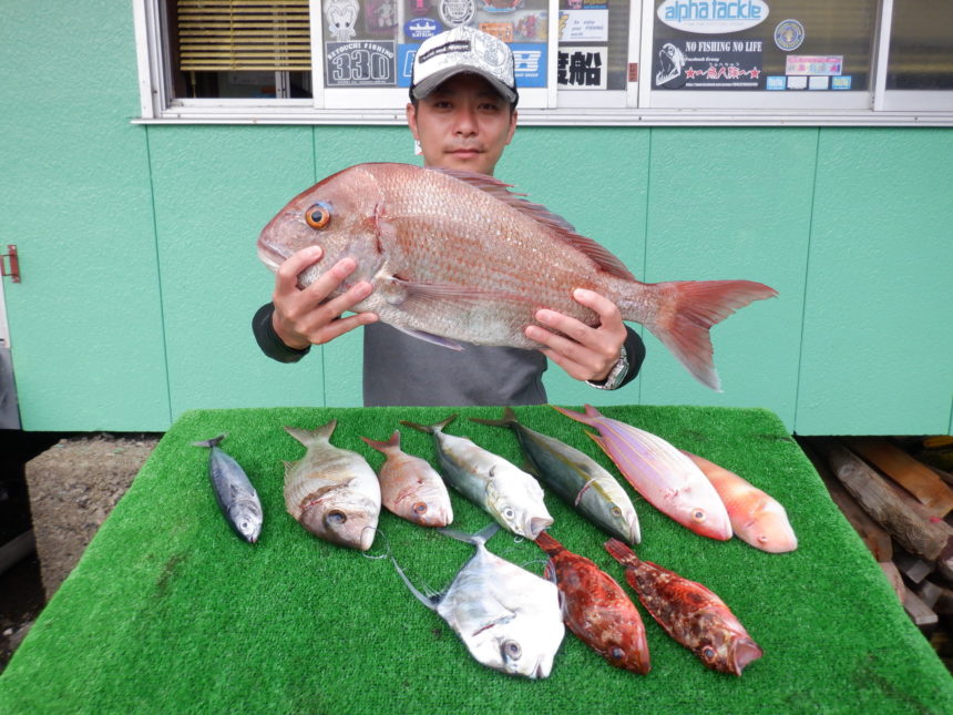船外機ボートで西村さんがマダイ61cm、メイチ、ツバス、カサゴ、イトヨリをゲット。