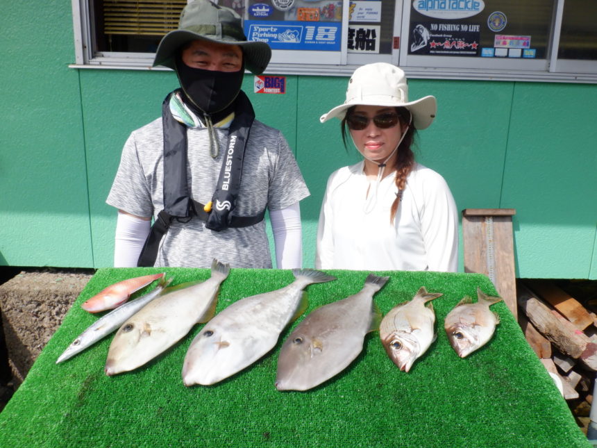 船外機ボートで牧森さんがウスバハギ、ツバス、メイチ、マダイをゲット。