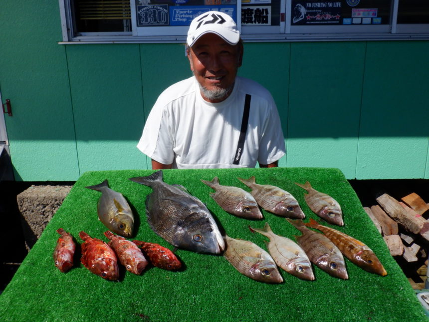 船外機ボートで牧森さんがウスバハギ、ツバス、メイチ、マダイをゲット。