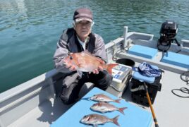 船外機ボートで安井さんがマダイをゲット。
