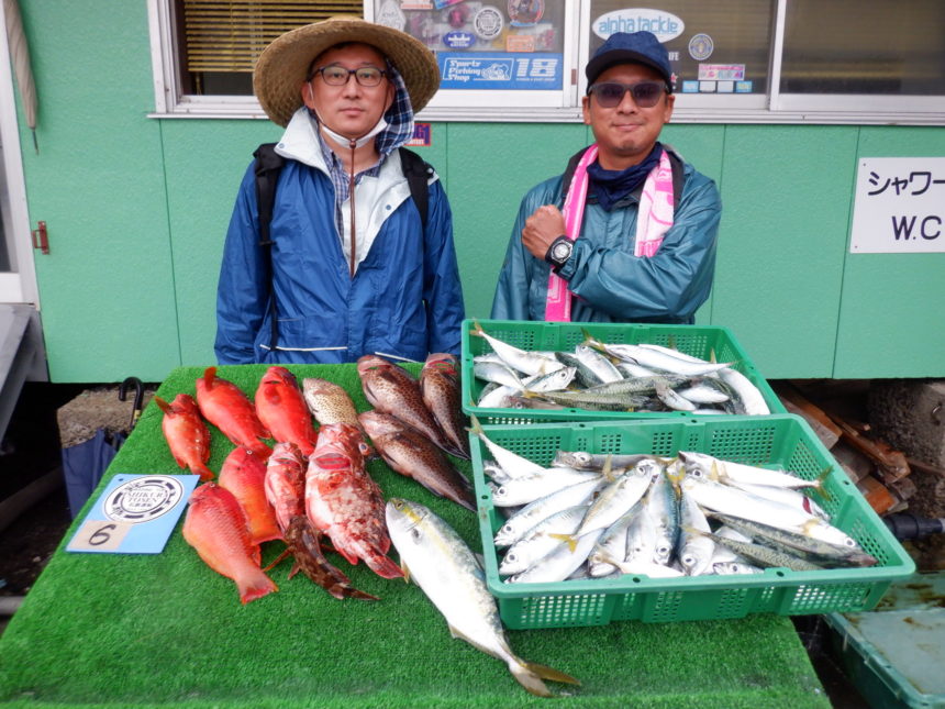 船外機ボートで山田さんがオオモンハタ、アカハタ、アジ、サバをゲット。