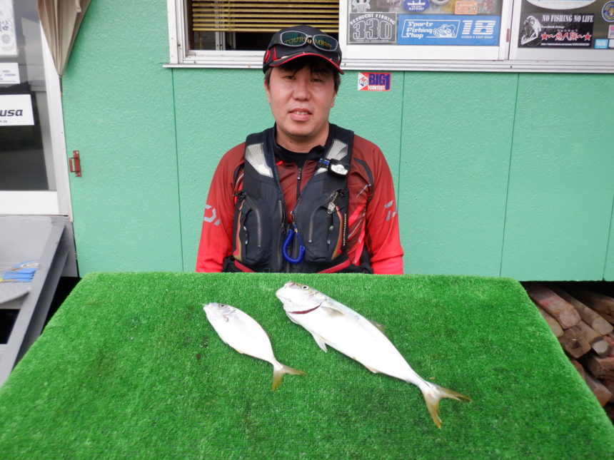 磯釣りで加藤さんがツバス、シマアジをゲット。