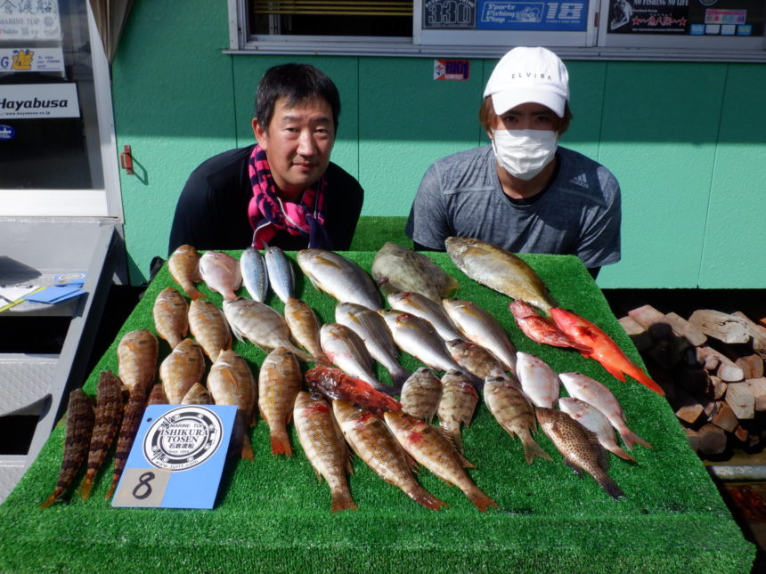 船外機ボートで奥山さんがシマアジ、ツバス、イサキ、カマスをゲット。
