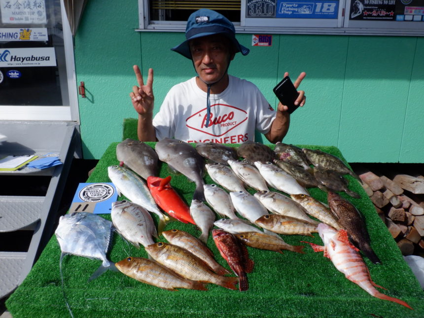 船外機ボートで石川さんがウスバ、ツバス、イトヒキアジ、メイチ、カワハギをゲット。