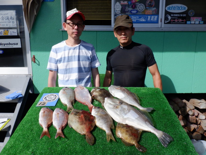 船外機ボートで長坂さんがウスバ、カワハギ、マダイをゲット。