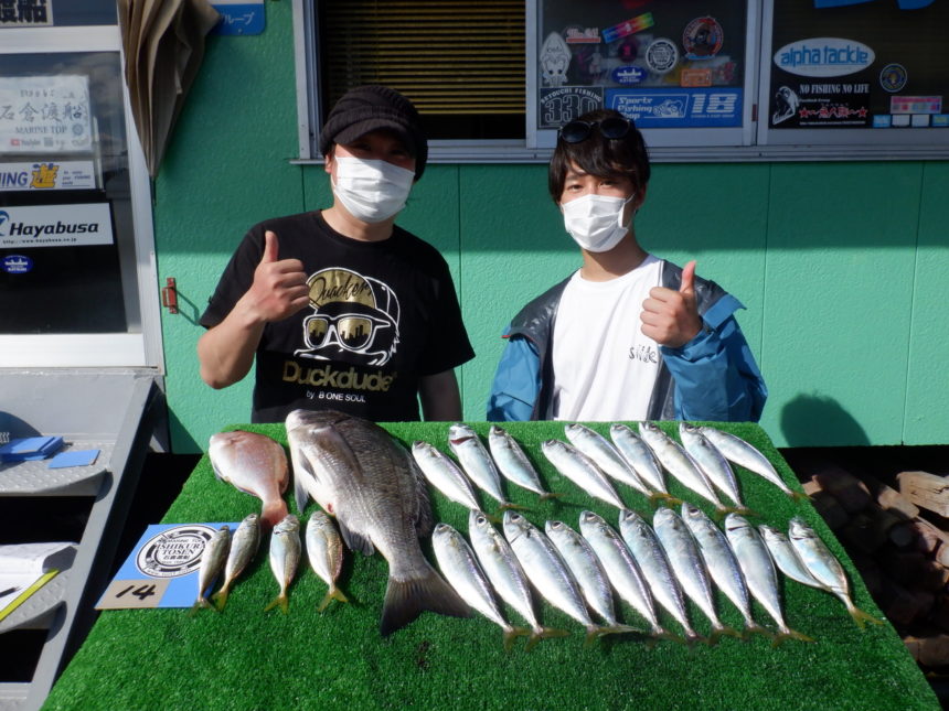 船外機ボートで佐藤さんがチヌ50cm、マダイ、サバ、アジをゲット。