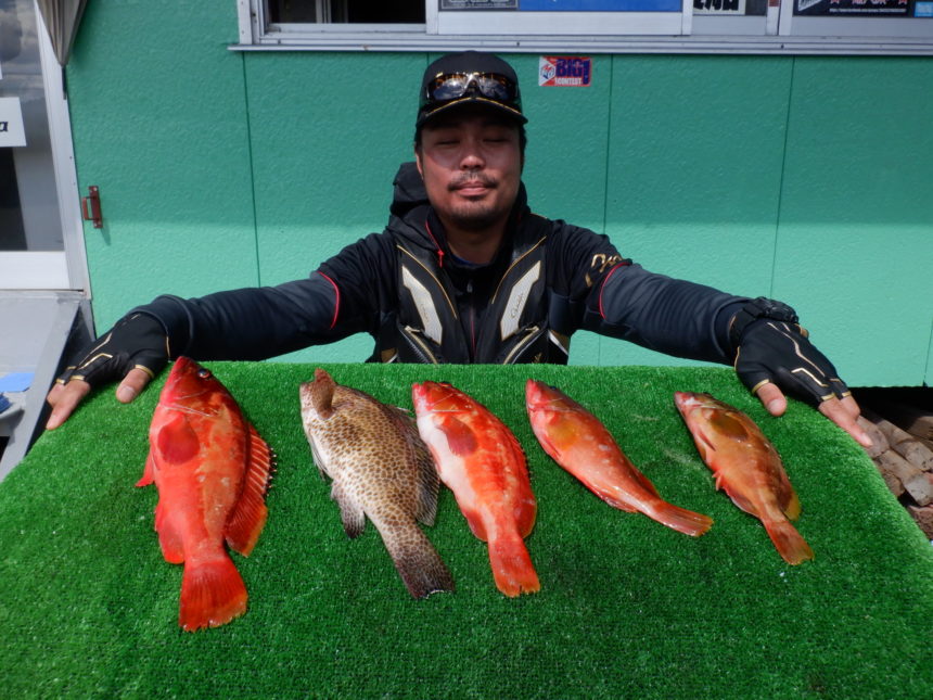 磯釣りで澄川さんがアカハタ、オオモンハタをゲット。